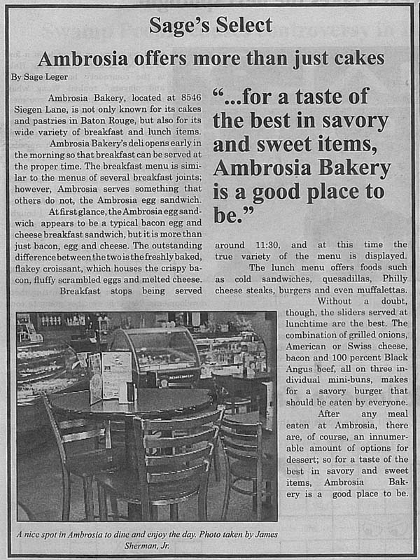 This article appeared in the October 2010 issue of Bearly Published Volume 36, No. 2 which is the news paper for Catholic High School in Baton Rouge, LA. Ā Thanks Sage for writing a great article about The Ambrosia Deli!