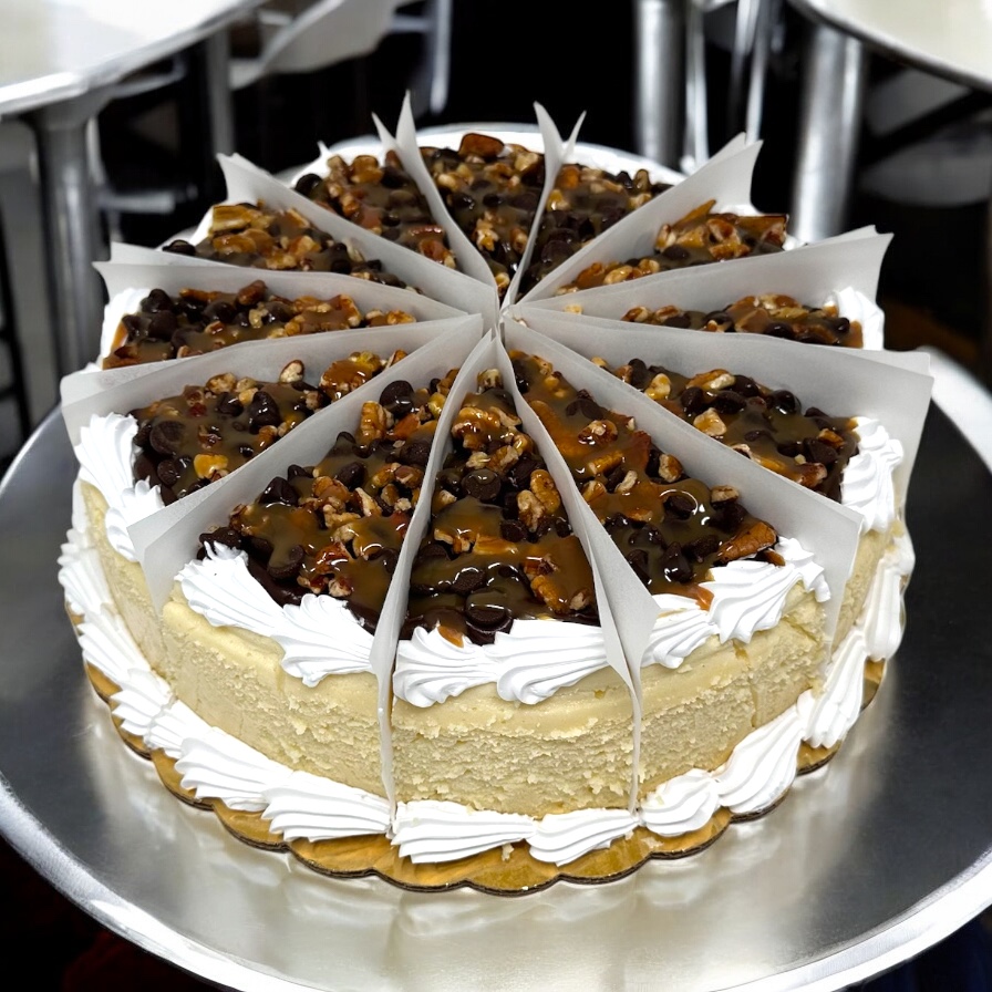 Our 9-inch Turtle Cheesecake is the ultimate treat for chocolate and caramel lovers! Creamy cheesecake is topped with crunchy pecans, smooth caramel, and rich chocolate morsels, creating a decadent combination of flavors and textures in every bite.
