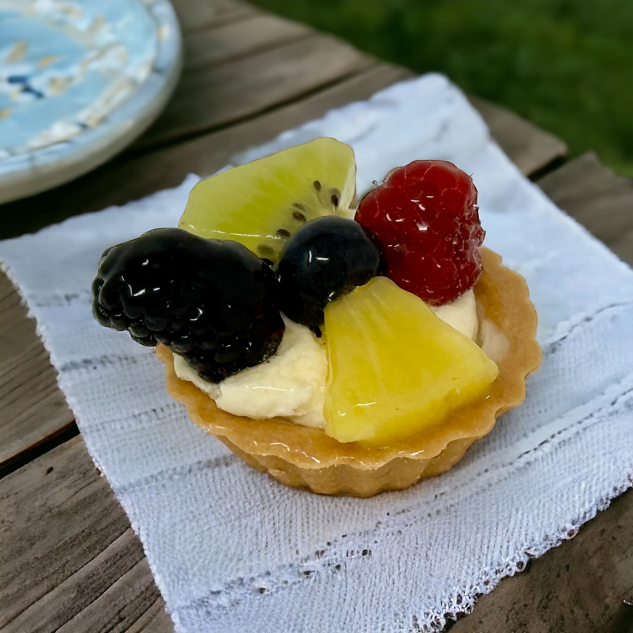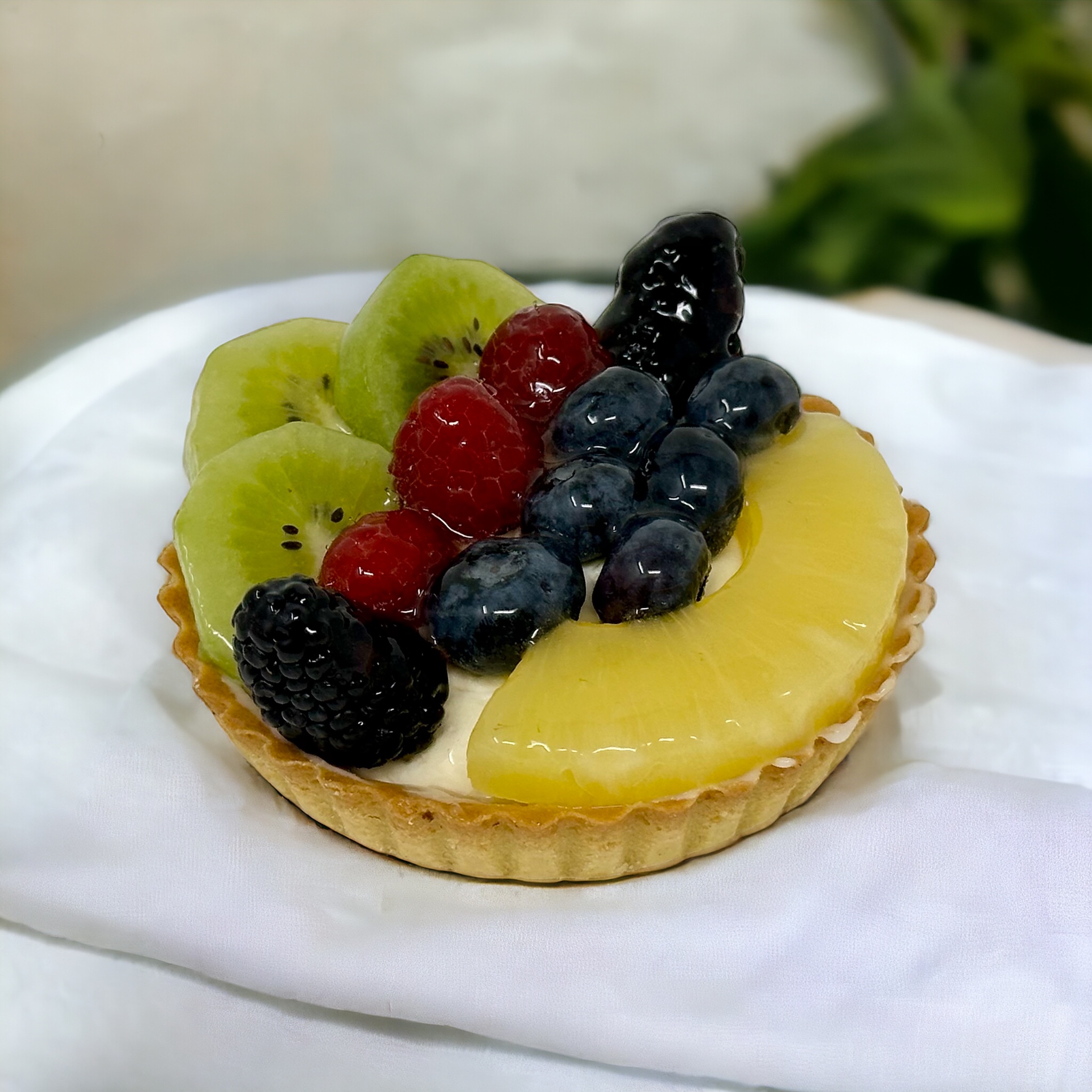 Welcome to our Fruit Tart paradise! Indulge in the delightful medley of flavors and colors with our exquisite Fruit Tart. Each tart is meticulously crafted with a buttery pastry shell filled to perfection with luscious pastry cream. Adorned with a vibrant array of pineapple, blueberries, raspberries, and kiwi, this tart is a feast for the eyes and the palate. Whether you're craving a refreshing treat or looking to impress at your next gathering, our Fruit Tart promises a taste sensation that's as beautiful as it is delicious.